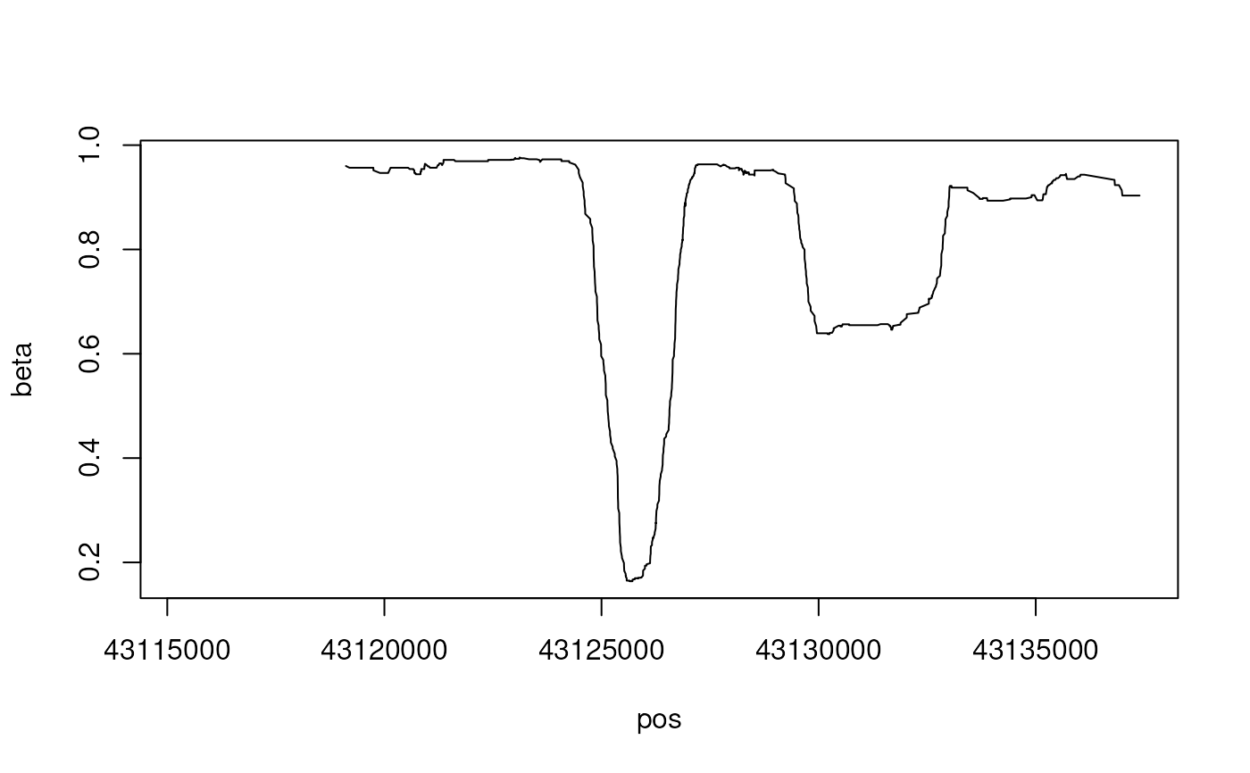 plot(cg.report[, .(pos, beta=data.table::frollmean(meth/(meth+unmeth), 100))], type="l")